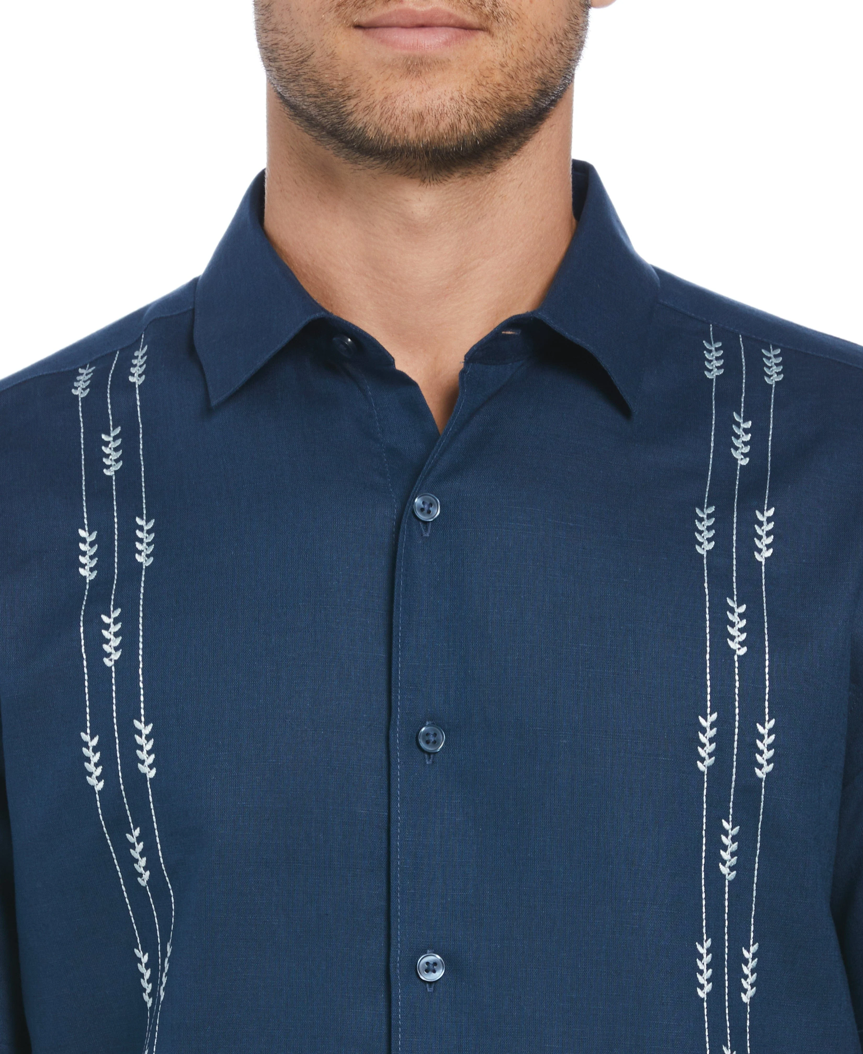 Linen Blend Leaf Embroidery Panel Guayabera Shirt