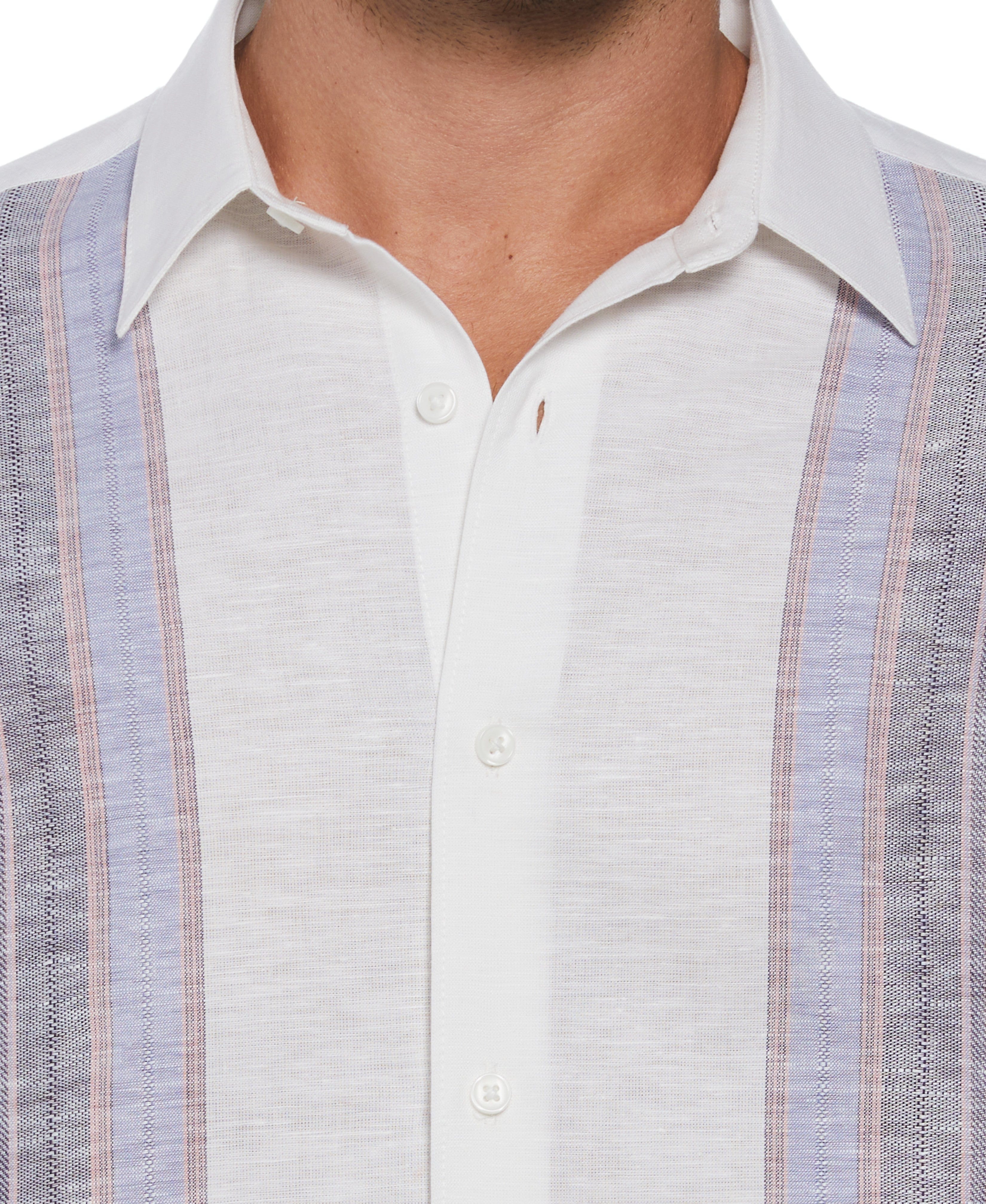 Crafted with a soft, breathable linen-cotton blend fabric, this men’s short sleeve button-up from Cubavera is a smart choice for warm weather wear. Dobby fabrication weaves raised geometric patterns into the material, giving the shirt a sophisticated textured appearance. The men’s short sleeve button-down shirt features yarn-dyed striped panels at the front and cuffed sleeves, which give it a relaxed feel great for everyday casual wear.